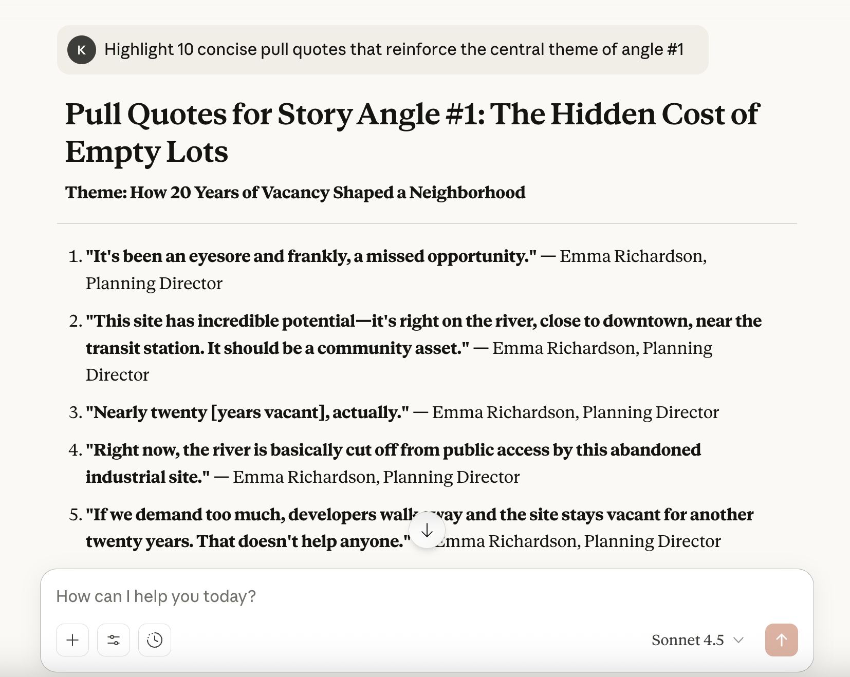 Once you've chosen your angle, the next step is gathering the quotes that will bring your story to life. Claude can scan the full transcript and surface the most relevant, compelling quotes.