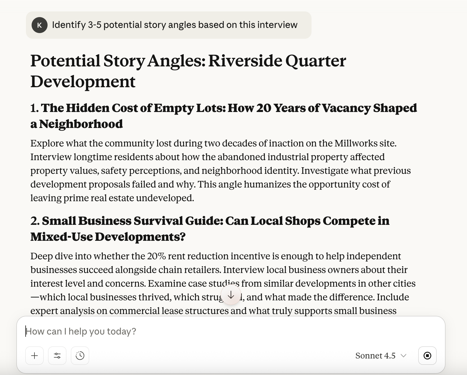 Now it's time for the exciting part: uncovering the best angles for your article. Ask Claude to scan your transcript and pinpoint the narrative threads that are most likely to resonate with readers.