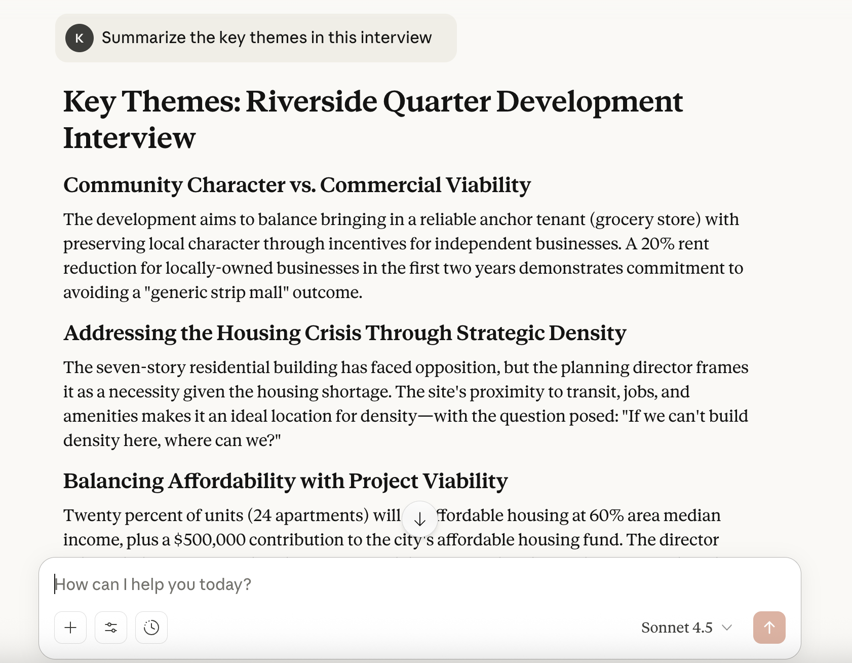 Before you look for hooks, it helps to get a broad read on the interview. Claude can quickly surface the main themes, tone, sentiment shifts, contradictions, and key moments, giving you a clearer sense of what the interview is really about.