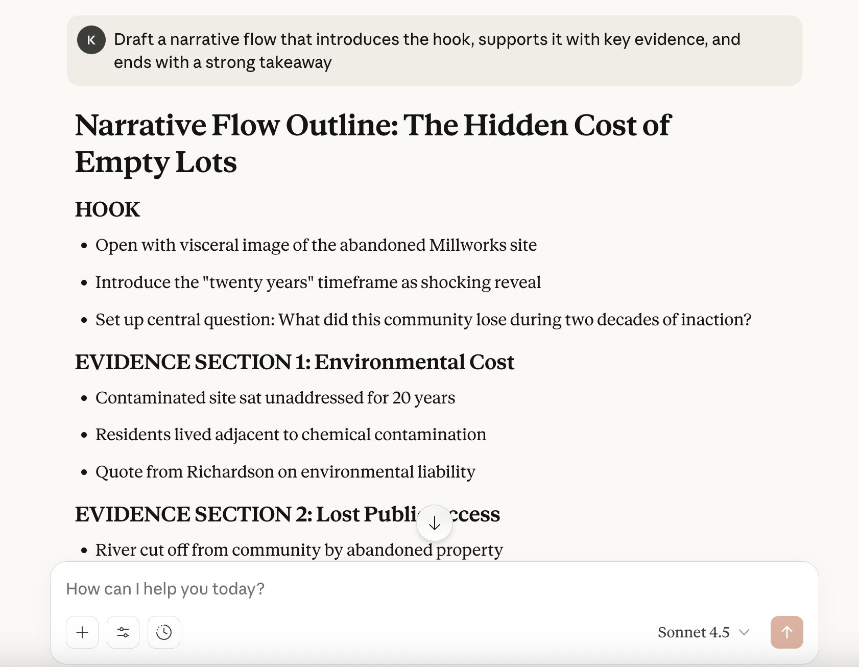 With your angle selected and your strongest quotes identified, the final step is shaping the interview into a clear, compelling story. Claude can help you turn raw material into a structured outline - without taking away your editorial judgment.